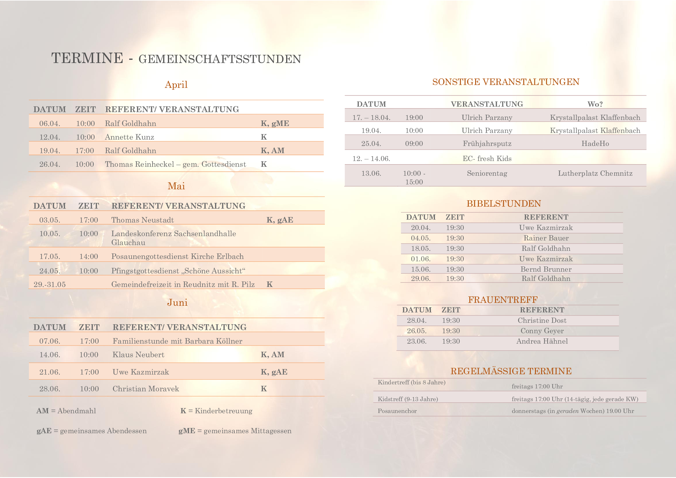 Hier versammeln sich Christen unseres Ortes, denen die Gemeinschaftspflege und der Dienst an Menschen verschiedenster Altersgruppen am Herzen liegt. Unsere wichtigsten Anliegen sind, Menschen die frohe Botschaft der Bibel weiterzusagen, unsere Hoffnung an andere weiterzugeben und für sie und unser Land zu beten und in vielfältiger Art zu dienen. Wir bieten Veranstaltungen zu verschiedenen Themen des christlichen und auch gesellschaftlichen Lebens. Musikalische Aktivitäten kommen natürlich nicht zu kurz.
